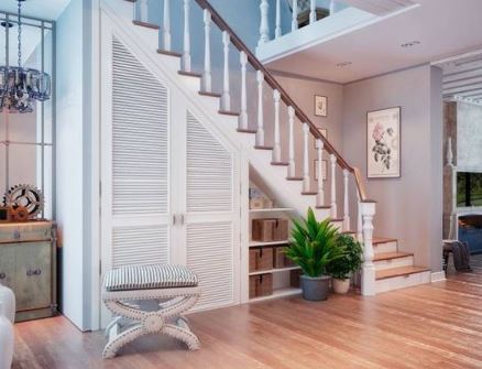 Una solución muy original para el diseño del espacio debajo de las escaleras es la colocación de unos estantes o de un armario abierto. Esta idea es perfecta para almacenar recuerdos y fotografías, o para crear una pequeña biblioteca doméstica. La ventaja de este tipo de armario es la simplicidad de diseño, es muy fácil de armar. Para equipar una estantería simple con sus propias manos, es suficiente con tener el material necesario y las habilidades mínimas para trabajar con las herramientas.